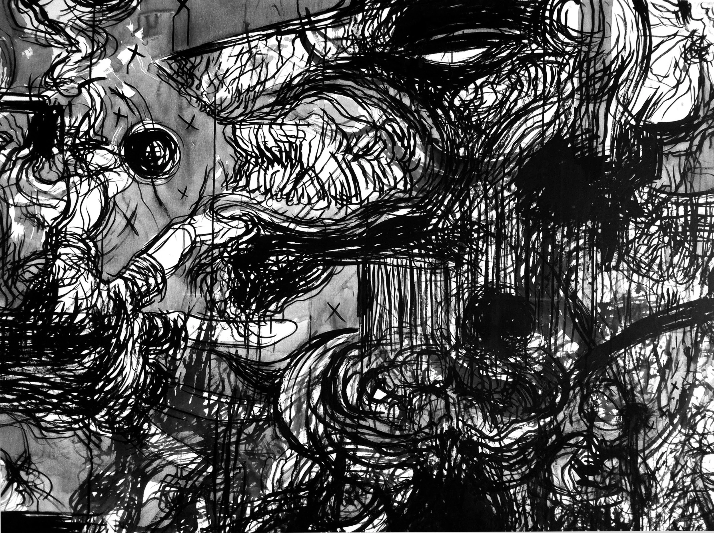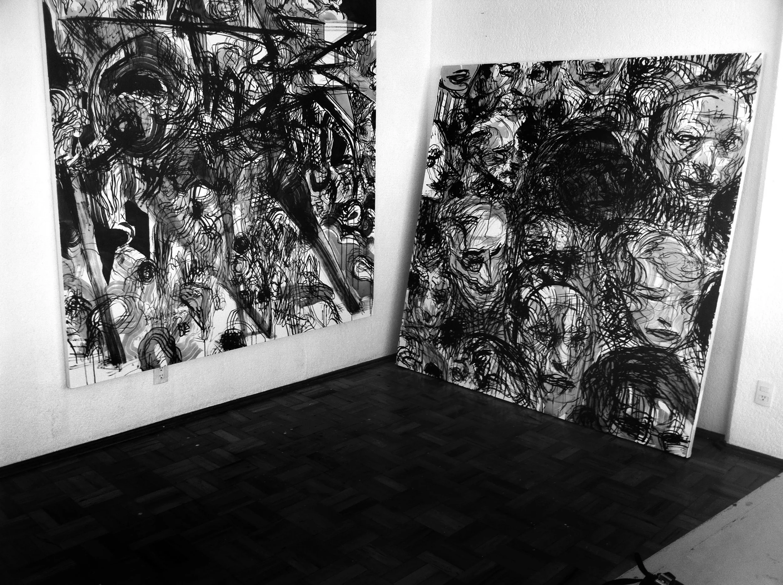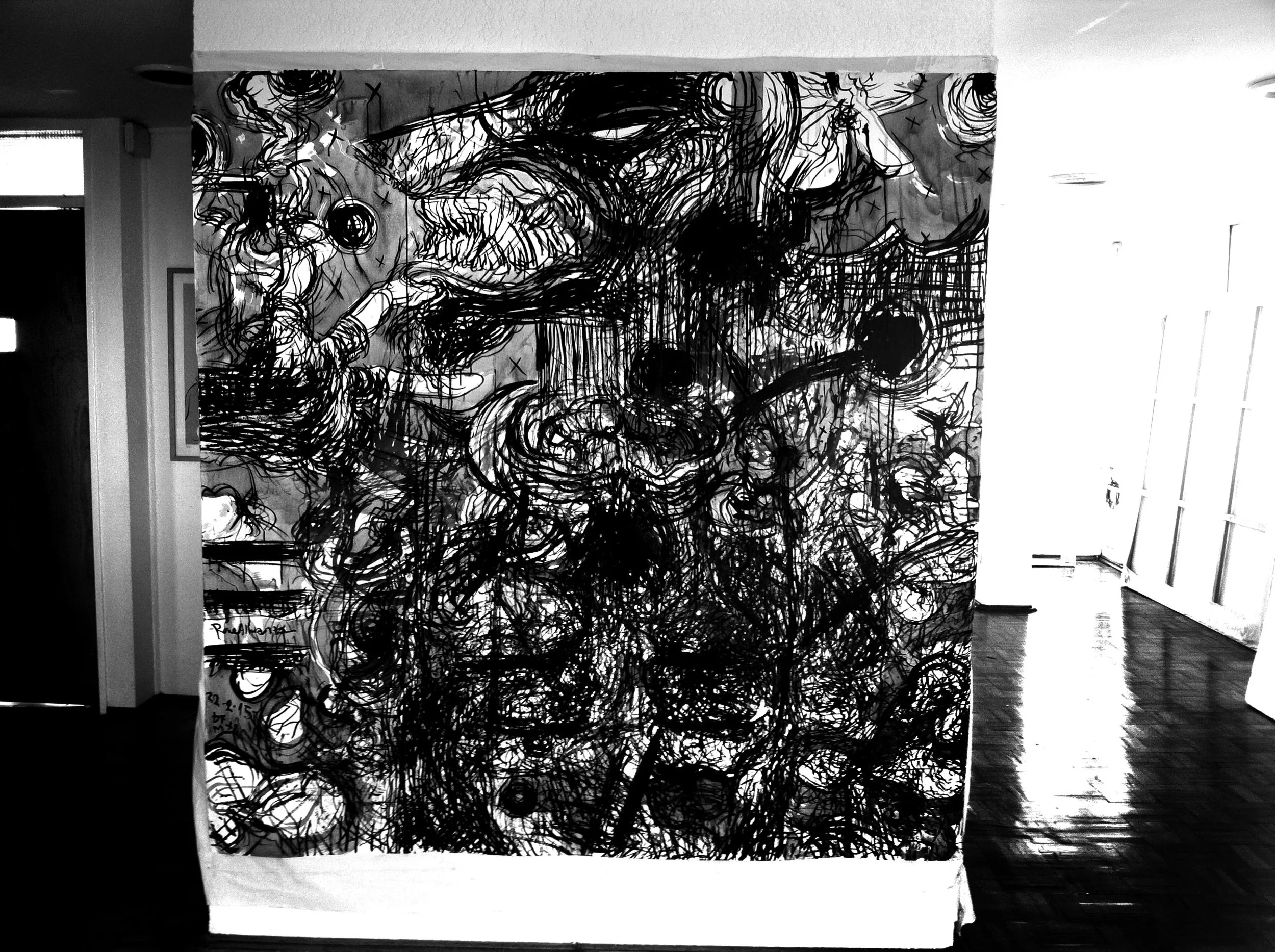 ‘The lines of my hands’ is a project in which Rene Almanza has set itself the task of reinventing the drawing activity with a tool he invented: the multiple drawing gloves. With this project, René is inserted into the long tradition of paragraph drawing machines, although his invention does not just fit into the idea of machine and is more a tool for drawing, the machines have generally been an aid for developing different drawing from its classical conception, especially to help generate the illusion of perspective or creating scale model. Almanza’s gloves were designed to open more and enhance the capacities and capabilities of expression in drawing, using pencils as an extension of the fingers, each falange top is extended with these gloves towards a tip of graphite or crayon. There are, indeed, artists in Mexico and the world which have explored the possibility and expression of multiple line, outstanding Francisco Toledo and Vlady in our country, but in this case the experiment exceeds the previous thing, as these lines are the result of the most diverse hand movements, organic and made with no fixed tools. The artist says, sometimes hands move as if they were modeling clay, like generating a three-dimensional sculpture. The initial series of this project is therefore a way of exploration, a manual almost, a record of the possibilities and proposals of the work that can be created by drawing with gloves. When Rene started telling me about this idea and showed me the gloves, we thought of creating a kind of character, a superhero or drawing anti hero, yet the very Rene Almanza discarded the possibility of giving the project a mythical tone, because the real matter is that he has discovered a tool which will then be used by others and even new ways and possibilities will be found, although he points out in its initial series the route to his own work processes, he knows that the multiple drawing gloves will have many ways to be used as the individual pencil has. This is the conceptual knot of this show, a selection of the work that Rene will develop from his first year of using the gloves.
