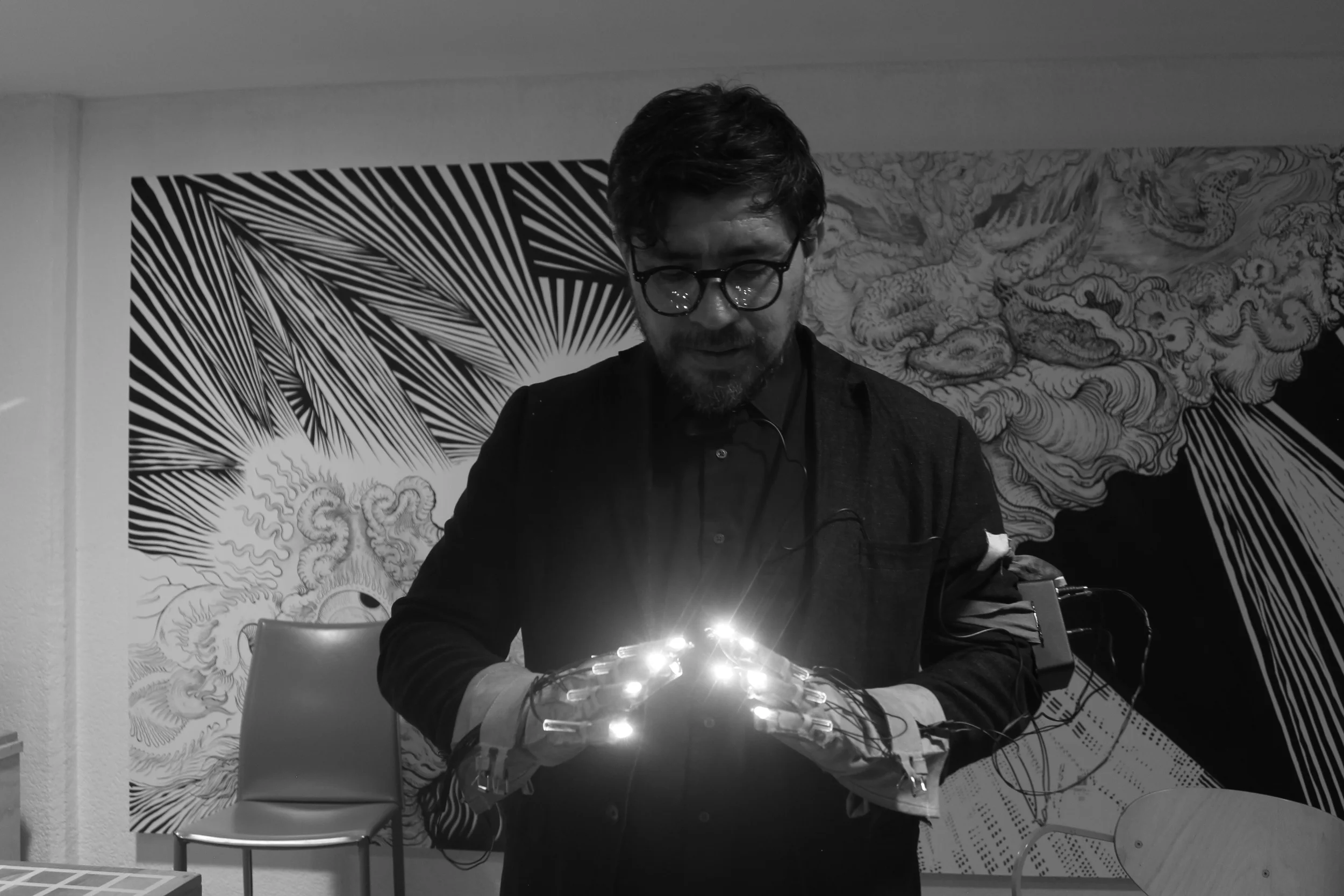 Las líneas de mis manos, es un proyecto mediante el cual René Almanza se ha propuesto la tarea de reinventar la actividad dibujística a partir de un utensilio inventado por él: los guantes de dibujo múltiple.
