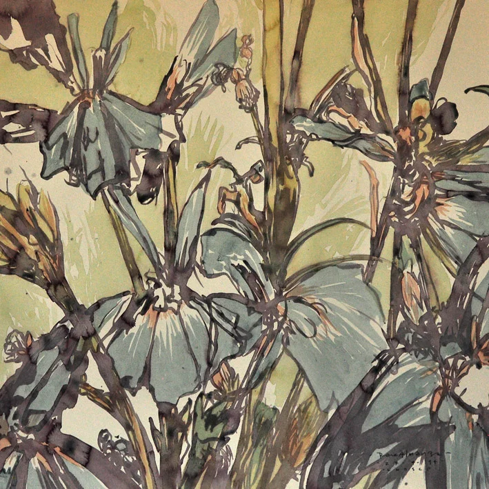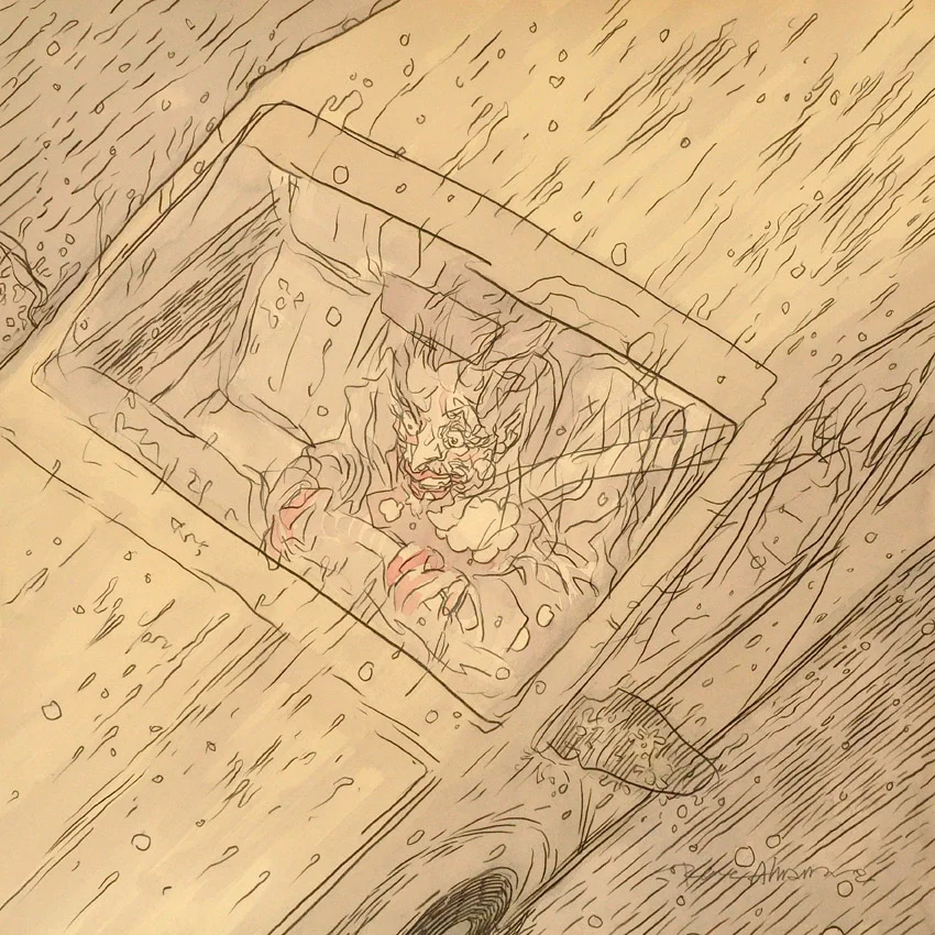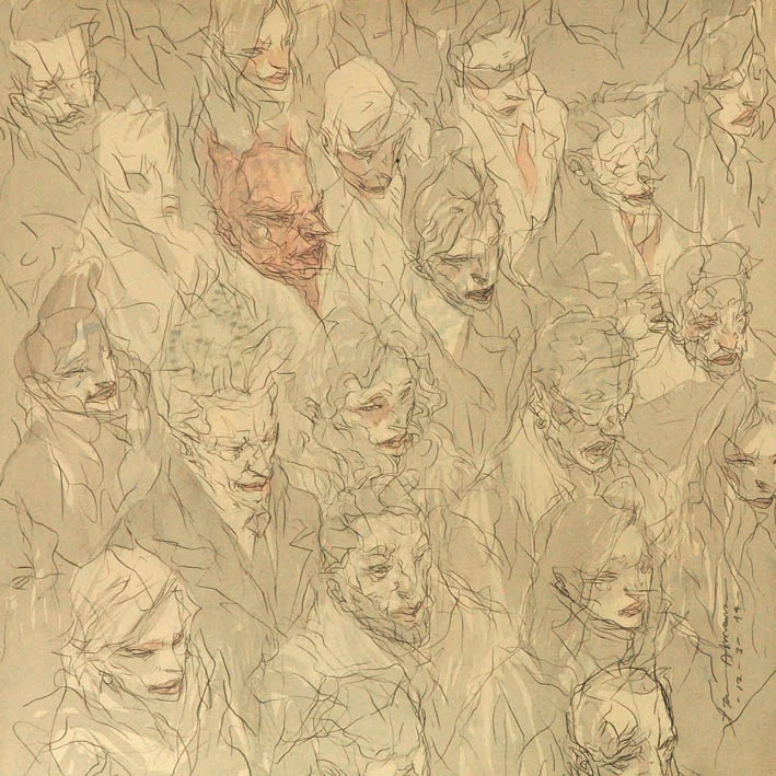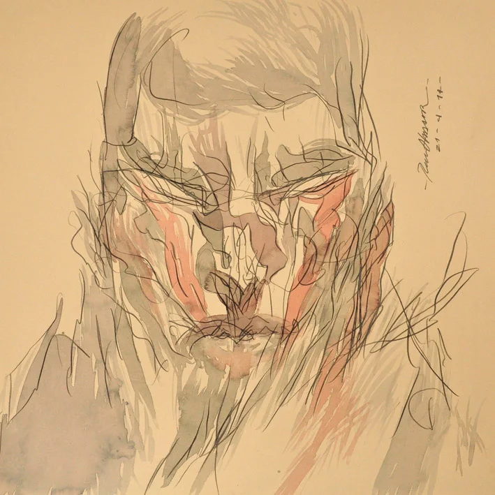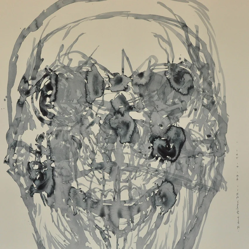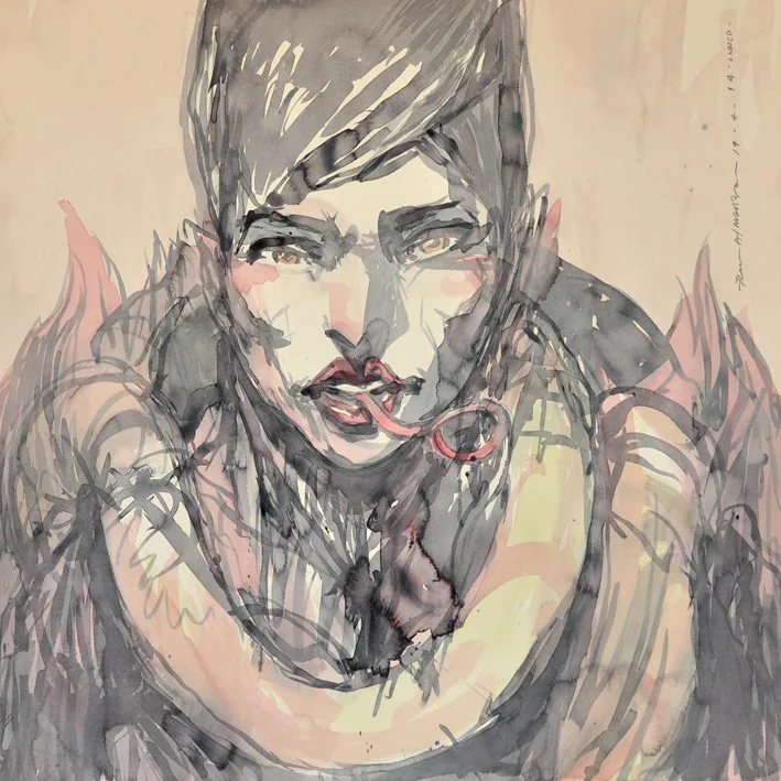 Por ejemplo, en “Manejando de bajada”, acuarela y tinta sobre papel algodón que muestra a un hombre al volante con los ojos desorbitados y en medio de algo que parece una tormenta, desconoceremos qué ha pasado antes de esa escena o cómo terminó el episodio, a menos que indaguemos. En esa imagen, una de las más abiertamente narrativas de las varias decenas que integran Landscape, su exposición individual más reciente para Fifty24Mx Gallery (Colima 184), está cifrado un momento que alude al origen del título de la muestra. Cuando se disponía a prepararla, sus intenciones eran explorar el paisaje en sus piezas, trabajar con la naturaleza. Quería pintar una montaña nevada próxima a Arteaga, en el norte, pero una serie de percances durante el día se lo impidieron. Al regreso, en la autopista de Saltillo a Monterrey, que es inclinada, muy recta y flanqueada por rocas, una granizada con lluvia transformaron el trayecto en una experiencia límite, riesgosa, que lo situó en un estado de alerta, un estado de consciencia que modificó su percepción.